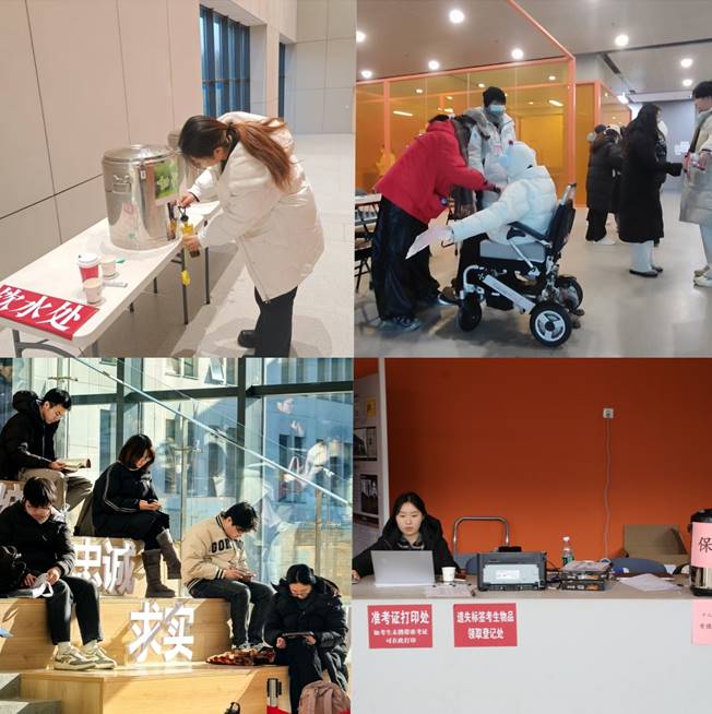 考试期间,学校统筹推进考生服务保障工作。免费提供咖啡、红糖姜汤、热开水等热饮,为寒冷天气中的考生补充能量、舒缓心绪。针对特殊需求考生,学校提前制定专项保障方案,志愿者全程陪同提供入校引导、通道通行、入场安检等全流程协助,用温情守护每一位考生的应考权益。