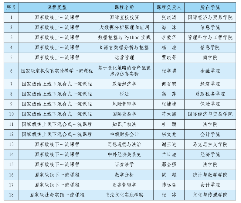 近日,教育部公布第三批国家级一流本科课程认定结果,我校18门课程成功入选。其中,线上一流课程5门、线下一流课程6门、线上线下混合式一流课程5门、虚拟仿真实验教学一流课程1门、社会实践一流课程1门。截至目前,我校国家级一流课程数量达51门,在全国财经类高校中位居前列。
