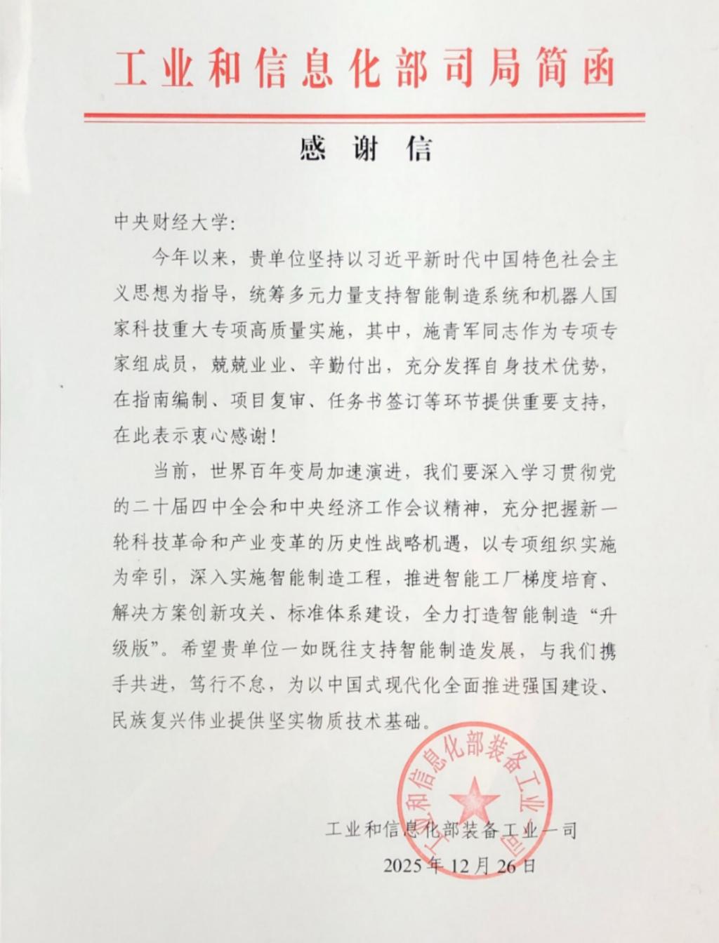 近日,工业和信息化部装备工业一司向我校发来感谢信,对政府管理学院施青军教授在智能制造系统和机器人国家重大科技专项工作中的专业贡献表示感谢。