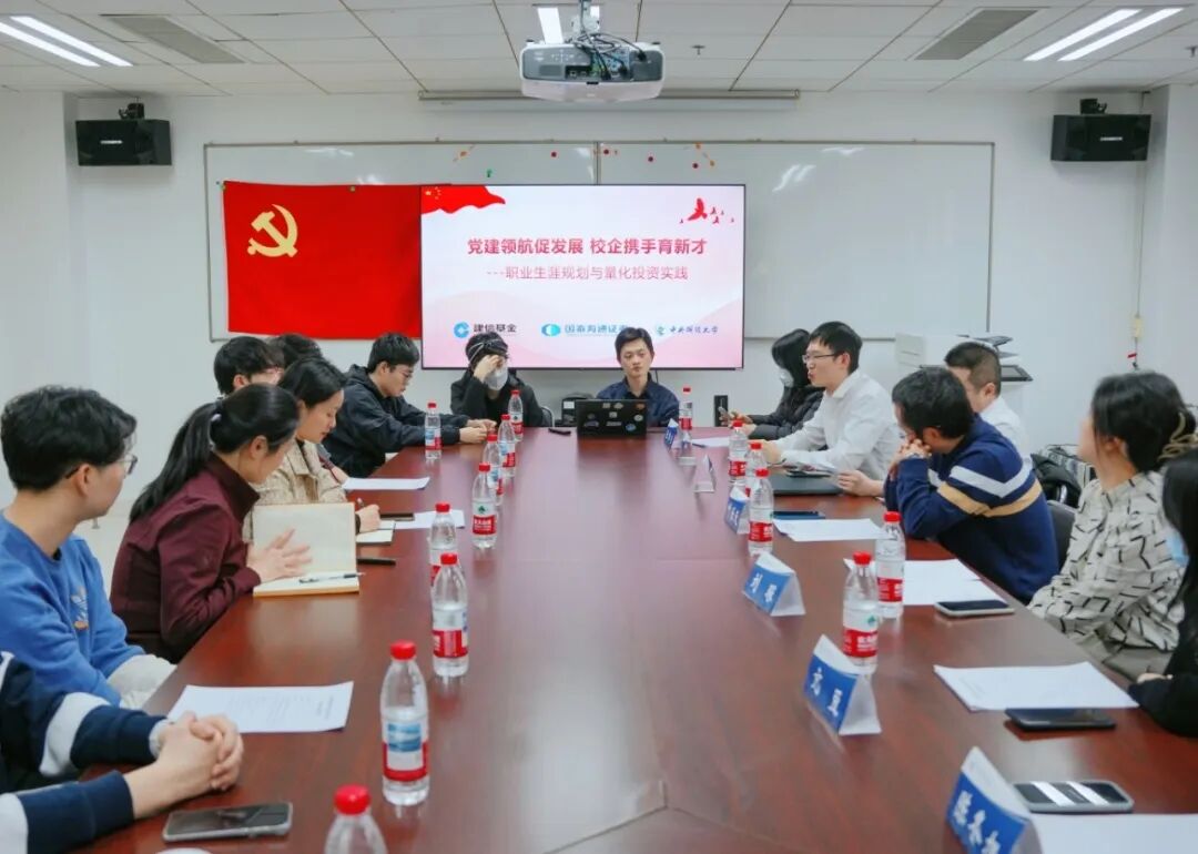 在行业分享环节,建信基金数量投资部党支部书记叶乐天,支部成员亢豆、陈冬旭、王茂铧等深入剖析了量化投资领域的发展趋势与人才需求。他们强调,数学建模与编程能力是量化领域的核心基础,但随着大模型技术的普及,对金融逻辑的深度理解与跨领域学习能力日益重要。国泰海通研究所金融工程分析师张雪杰、策略分析师李健、华北公募机构销售部张唯佳等,围绕职业规划与路径选择,与同学们展开深度交流。