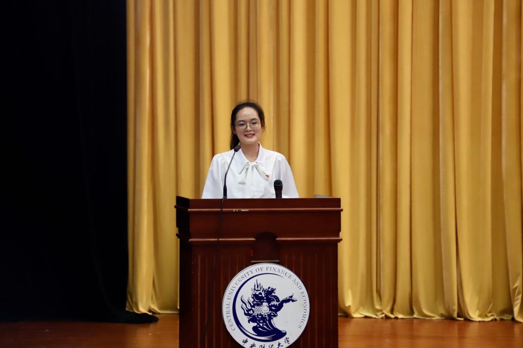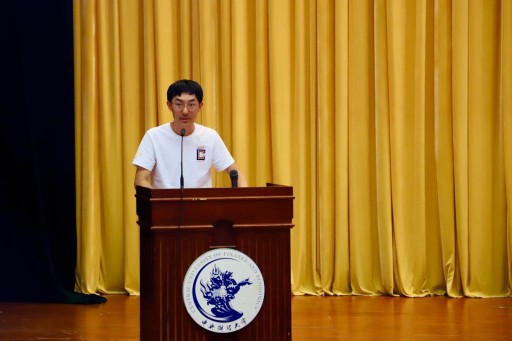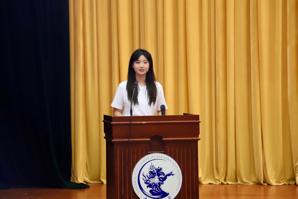 中国金融发展研究院2025级本科生王宇凡代表本科新生发言。他回顾自开学以来的种种经历,指出他从中感受到了中财大的热情与温暖。他表示,大家应当共怀“经世济民”的理想抱负,将青春融入财经报国的浪潮。在未来勤学笃行,努力成为专业领域的探索者,走向世界的创新者。
